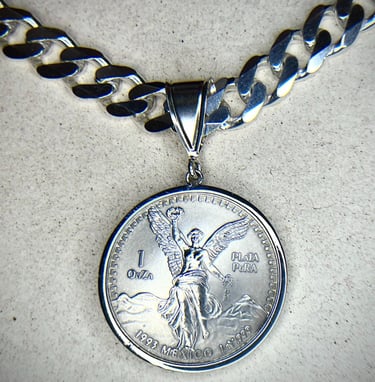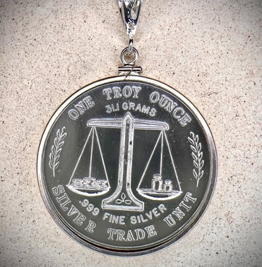 The Heart of our Handcrafted jewelry begins with a high quality Silver Coin or .999 Silver Round. Your coin is then wrapped in .999 Silver bezel wire and topped with a sized bezel of your choice for proper chain size fit.